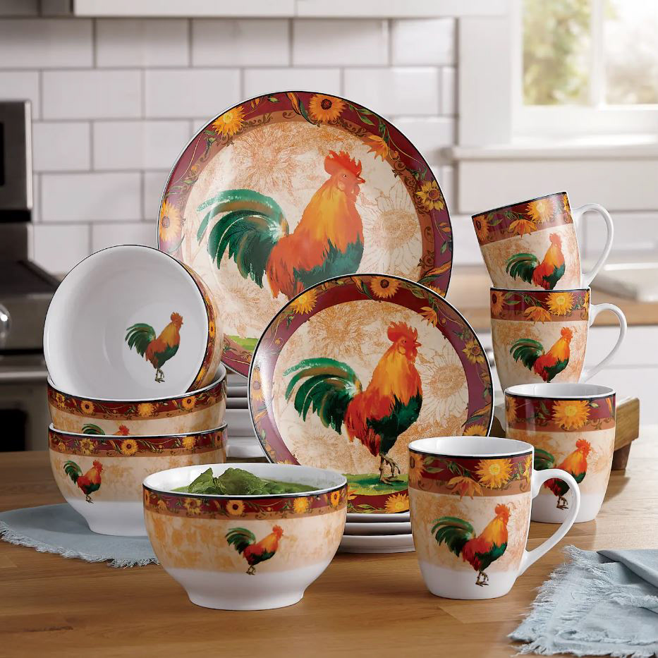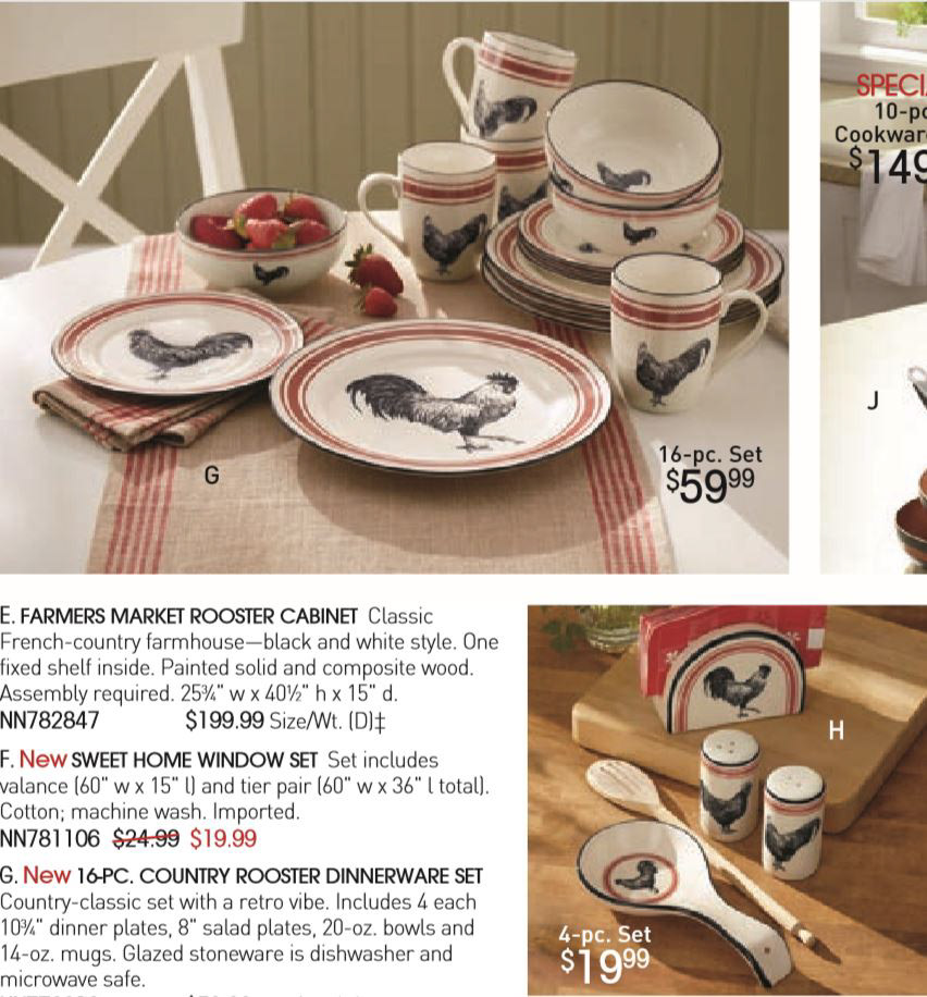 Simple vintage rooster dinnerware inspired by ticking stripe farmhouse textiles.